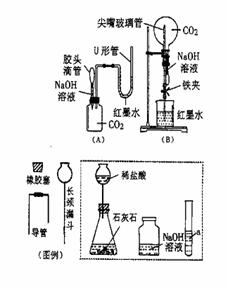 ⑴照装置A挤压胶头滴管,可观察到U形管中的红墨水液面左高右低,甚至红墨水被吸入集气瓶中,原因是 ,化学方程式为 。