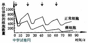 6.化疗是控制癌细胞生长的方法之一,药物可以杀死癌细胞,右图给出的是一个典型的化疗过程,每3周给药1次(图中箭头所示),图中记录了化疗过程中正常细胞和癌细胞的数量变化。以下说法错误的是