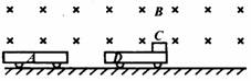 25.(19分)如图所示,置于光滑水平面上的绝缘的小车A、D足够长,质量分别为mA=3 kg、mD=0.5kg,可视为质点的带正电的带电体C,带电量q=0.2C,并位于D车最右端,整个空间有一沿水平方向的匀强磁场,磁感应强度B=10T,小车D、带电体C静止。小车A以初速度υA=10m/s垂直于磁场方向右运动,并与小车D正碰,碰撞时间极短。已知碰后瞬时小车D的速度为9m/s,物体C与D之间有摩擦,其它摩擦不计,g取10m/s2,求: