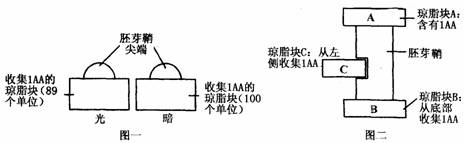 (2)图二表示进一步研究生长素通过玉米胚芽鞘的运输实验。图中琼脂块A含有生长素,