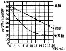 糖溶液若干和1 mL的0.1%亚甲基蓝溶液,封口后置于30℃水浴中维持20min,这段时间内,每隔2min测量-次蓝光通过试管的百分率。测定完成后,再分别用0.5%蔗糖和0.5%乳糖及等量酵母菌重复上述实验。结果如上图所示: