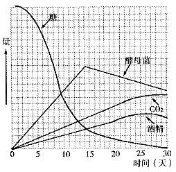 I.(10分)生产上常使用酵母菌进行酿酒,下面是某校生物小组的同学们模拟工业酿酒的过程:在一只盛有糖溶液的瓶中加入酵母,在适宜条件下培养了30天。30天内混合物的变化情况如下图所示。请回答下列问题: