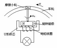 16.如图是一种自行车上照明用的车头灯发电机的结构示意图,转轴的一端装有一对随轴转动的磁极,另一端装有摩擦小轮。电枢线圈绕在固定的U形铁芯上,自行车车轮转动时,通过摩擦小轮带动磁极转动,使线圈中产生正弦交流电,给车头灯供电。