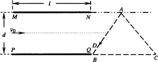 (20分)两块平行金属板MN、PQ水平放置,两板间距为d、板长为l,在紧靠平行板右侧的正三角形区域内存在着垂直纸面的匀强磁场,三角形底边BC与PQ在同一水平线上,顶点A与MN在同一水平线上,如图所示.一个质量为m、电量为+q的粒子沿两板中心线以初速度v0水平射入,若在两板间加某一恒定电压,粒子离开电场后垂直AB边从D点进入磁场,BD=