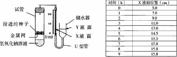 11. (14分)将某种植物种子在水中浸透,然后按左下图装置进行实验,实验开始时x液面位置与Y液面位置调至同一水平。下表记录了实验过程中每小时的液面变化情况。清回答下列问题: