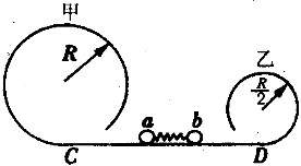 2.(11分)如图所示,甲、乙两光滑圆轨道放置在同一竖直平面内,甲轨道半径是R且为乙轨道半径的2倍,两轨道之间由一光滑水平轨道CD相连,在水平轨道CD上有一轻弹簧被 a、b两个小球夹住,但不拴接.如果a、b两个小球的质量均为m,同时释放两小球,且要求a、b都能通过各自的最高点,则弹簧在释放前至少具有多大的弹性势能?