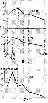读以下两图,图甲显示2000年前后各国的每年伐林率,图乙为X地区某块农用土地的有机物、氮及钾的含量。分析回答问题。