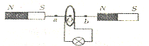 自己制作了一个手动手电筒,下图是该手电筒的简单结构示意图,左右两端是两块完全相同的条形磁铁,通过一根绝缘直杆相连,由绝缘细铜丝绕制的多匝环形线圈只可在直杆上左右自由滑动,线 圈两端接一灯泡,晃动手电筒时线圈也来回滑动,灯泡就会发光,其中O点是两磁极连线的中点,a、b两点是线圈运动经过的两点,且关于O点对称,则下列说法正确的是 ( )
