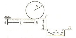 24.(16分)一电动小车沿如图所示的路径运动,小车从A点由静止出发,沿粗糙的水平直轨道运动L后,由B点进入半径为R的光滑竖直圆形轨道,运动一周后又从B点离开圆轨道进入水平光滑轨道BC段,在C与平面D间是一蓄水池,已知小车质量m=0.lkg、L=l0m、R=0.32m、h=1.25m、s=1.50m,在AB段所受阻力为0.3N.小车只在AB路段可以施加牵引力,牵引力的功率为P=1.5W,其他路段电动机关闭.问:要使小车能够顺利通过圆形轨道的最高点且能落在右侧平台D上,小车电动机至少工作多长时间?(g取l0m/s2,结果保留三位有效数字)