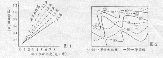 4.若地下水矿化度为5克/升,则图2中土壤含盐量大于等于0.8%的点有 ( )