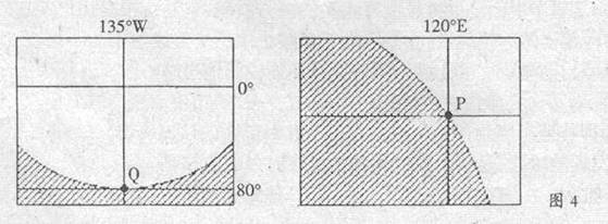 下面两幅图是同一时刻地球上两区域昼夜分布情况(图4),阴影部分表示黑夜。读图回答10-11题。