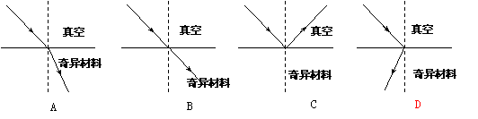 14. 2006年12月,德国的一个研究小组制造出了一种对可见光具有负折射率的奇异材料。普通材料遵循光的折射定律,其折射率始终是正值,而这种奇异材料的折射率为负值。当光从真空射入这种奇异材料,发生折射现象,你认为下面四个图哪一个是可能的
