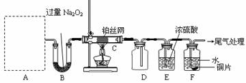 检查装置气密性后,先将C处铂丝网加热至红热,再将A处产生的气体通过B装置片刻后,撤去C处酒精灯。部分实验现象如下:铂丝继续保持红热,F处铜片逐渐溶解。![]()