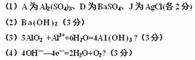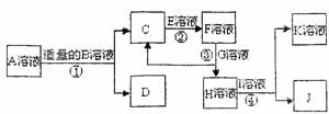 已知C、D、J都是白色沉淀,其中D、J不溶于稀硝酸。试按要求回答下列相关问题:(1)A、D、J的化学式为:A 、D 、J ;(2)相同条件下,物质的量浓度相同的B溶液和E溶液pH较大的是 (用化学式表示);(3)写出反应③的离子方程式: