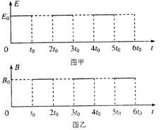 (20分)两块足够大的平行金属板水平放置,板间加有分布均匀且随时间周期性变化的电场和磁场,变化规律如图甲、乙所示,规定垂直纸面向里为磁感应强度的正方向,当t=0时由负极板释放一个初速为零的带负电粒子(不计重力)。已知,电场强度E0、磁感应强度B0、粒子的比荷