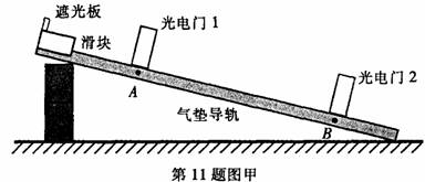 (10分)某研究性学习小组采用如图甲所示的装置,探究物体的加速度与所受合外力的关系.提供器材有:气垫导轨(总长度为L)、滑块(总质量为m,装有宽度为d的遮光板)、光电门两只(配接数字计时器)、木块若干、米尺.在一次实验中,测出两光电门AB间的距离为L。,导轨顶端距水平面的高度为h,接通气源,让滑块从导轨顶端由静止开始向下运动,读出遮光板通过光电门1的时间为tl,通过光电门2的时间为t2,重力加速度为g