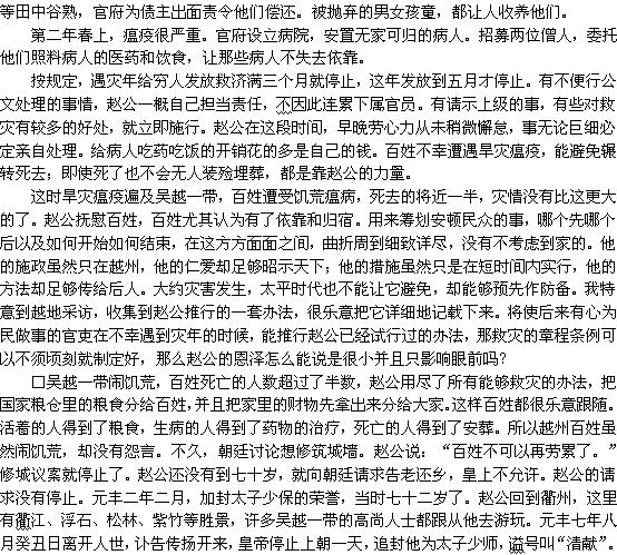 □熙宁八年夏天,吴越一带遭遇严重旱灾。这年九月,资政殿大学士赵公出仕越州长官。在百姓未被饥荒所苦之前,就下文书询问所属各县遭受了灾害的有多少乡,百姓能够养活自己的有多少户,应当由官府供给救济粮的有多少人,可以雇用民工修筑沟渠堤防的有多少处,仓库里的钱粮可供发放的有多少,可以征募出粮的富户有多少,让各县呈文上报知州,并且谨慎地作好准备。