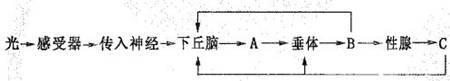 (1)图解中的A、B、C分别代表下丘脑、垂体和性腺分泌的物质,(提示:下丘脑和垂体对性腺和甲状腺分泌活动的调节机理相似。)根据所学知识推断它们名称应该是: