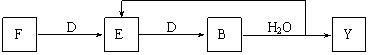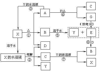 (10分)A-G及X、Y均是中学化学常见物质,其中B、D、E、F、G在常温下为气体且B为红棕色,C的硫酸盐溶液通常为蓝色,它们之间有如下转化关系(其中反应