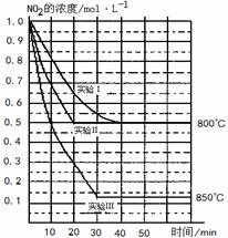 2NO(g)+O2(g)在三种不同条件下进行,其中实验Ⅰ、Ⅱ都在800℃,实验Ⅲ在850℃,NO、O2的起始浓度都为0,NO2的浓度(mol·L―1)随时间(min)的变化如图所示(不考虑生成N2O4)。试填空。