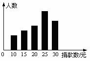 21.(本题满分8分)对某校学生会倡导的“献爱心,送温暖”自愿捐款活动进行抽样调查,得到一组学生捐款情况的数据.下图是根据这组数据绘制的统计图,图中从左到右各矩形的高度之比为3:4:5:8:6,又知此次调查中捐款10元和30元的学生一共27人.