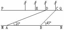 25.(本题满分10分)如图,泰州园博园中有一条人工河,河的两岸PQ、MN互相平行,河岸PQ上有一排间隔为50米的彩灯柱C、D、E、……,某人在河岸MN的A处测得∠DAN=21º,然后沿河岸走了175米到达B处,测得∠CBN=45º,求这条河的宽度.(参考数据: