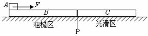 (18分)如图所示,水平面分为两个区,P线左侧为粗糙区,右侧为光滑区.紧靠P线在左侧上放一长L1=1m、质量M1=3kg的长木板B,在右侧上放一质量M2=3kg的长木板C.B、C不粘连.在长木板B的左端放一可看作质点的质量m=2kg的小木块A.已知B与A、B与水平面、C与A之间的滑动摩擦因数均为μ=0.2.现给A施加一个F=8N的水平恒力,经1s后就撤去该恒力.