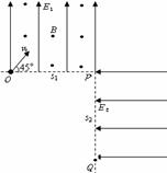 E1=2500N/C,方向竖直向上;磁感应强度B=103T,方向垂直纸面向外;有一质量m=1×10-2kg、电荷量q=4×10-5C的带正电小球自O点沿与水平线成45°以v0=4m/s的速度射入复合场中,之后小球恰好从P点进入电场强度E2=2500N/C,方向水平向左的第二个匀强电场中.不计空气阻力,g取10m/s2.求: