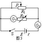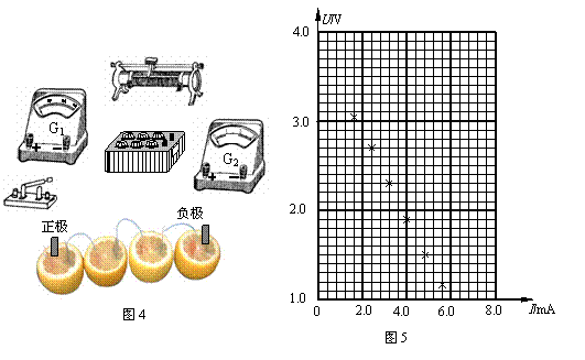 ②该同学用电流表G2和改装成的电压表测量水果电池的电动势和内阻,设计了如图3所示的实验电路图。请根据电路图,将图4中的实物连接成实验用的电路。