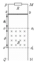 (16分)如图竖直放置的光滑平行金属导轨MN、PQ相距L,在M点和P点间接一个阻值为R的电阻,在两导轨间 OO1O1′O′ 矩形区域内有垂直导轨平面向里、宽为d的匀强磁场,磁感应强度为B.一质量为m,电阻为r的导体棒ab垂直搁在导轨上,与磁场上边边界相距d0.现使ab棒由静止开始释放,棒ab在离开磁场前已经做匀速直线运动(棒ab与导轨始终保持良好的电接触且下落过程中始终保持水平,导轨电阻不计).求: