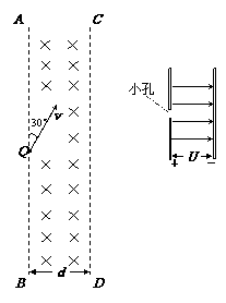 (17分)如图所示,在空间中存在垂直纸面向里的场强为B匀强磁场,其边界AB、CD的宽度为d,在左边界的Q点处有一质量为m,带电量为负q的粒子沿与左边界成30o的方向射入磁场,粒子重力不计.求: