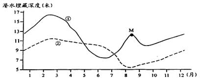 下面是我国两地潜水埋藏深度年变化曲线图,读图回答10-11题。