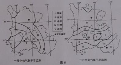 材料一 2010年1月中旬和3月中旬我国某区域干旱等级分布图。