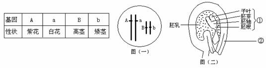 31、(20分)某表现型为紫花高茎的雌雄同花植株,其基因型是AaBb。有关基因与所控制的性状如下表,细胞中有关染色体与基因位置如图(一)所示。请回答: