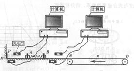 24.(16分)如图所示,为光电计时器的实验简易示意图。当有不透光物体从光电门问通过时,光电计时器就可以显示物体的挡光时间。光滑水平导轨MN上放置两个相同的物块A和B,左端挡板处有一弹射装置P,右端N处与水平传送带平滑连接,今将挡光效果好,宽度为d=3.6×10-3m的两块黑色磁带分别贴在物块A和和B上,且高出物块,并使高出物块部分在通过光电门时挡光。传送带水平部分的长度L=8m,沿逆时针方向以恒定速度v=6m/s匀速转动。物块A、B与传送带间