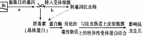 下图表示从苏云金芽孢杆菌分离出来的杀虫晶体蛋白质基因(简称Bt基因)及形成转基因抗虫棉的图解。请回答:
