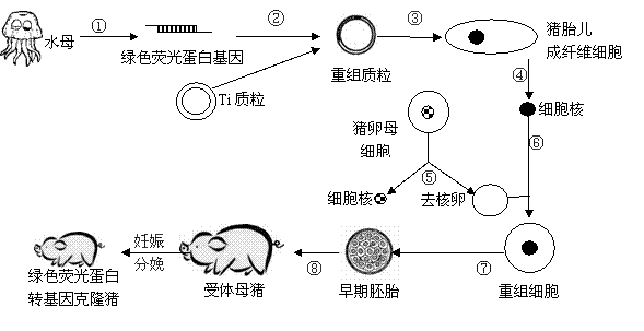 1.(14分)2008年诺贝尔化学奖授予了三位在研究绿色荧光蛋白(GFP)方面做出突出贡献的科学家。绿色荧光蛋白能在蓝光或紫外光的激发下发出荧光,这样借助GFP发出的荧光就可以跟踪蛋白质在细胞内部的移动情况,帮助推断蛋白质的功能。我国首例绿色荧光蛋白转基因克隆猪在东北农业大学的种猪场自然分娩产出,这标志着我国在转基因克隆猪技术领域已达到世界领先水平。下图为我国首例绿色荧光蛋白转基因克隆猪的培育过程示意图,请据图回答: