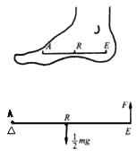 思路分析:如图4-4所示,脚踮起来后,以A点为固定转轴,根据力矩平衡可求出F。此人在搬运过程中所消耗的能量等于人和物体所做的功的和,由于每摩尔葡萄糖彻底氧化分解产生2870kJ的能昨,其中仅1255kJ的能量贮存在ATP中,用以做功;用 搬运过程中所做的功,即所消耗的能量除以1255,就得出消耗葡萄糖的物质的量。