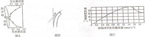 (3)切除玉米胚芽鞘的顶端,然后在其左侧放置含有不同浓度生长素的琼脂块,保持在黑暗中12h。胚芽鞘可能向右弯曲,弯曲角度如图B所示。生长素浓度与弯曲角度关系如图C 所示。实验要在黑暗中进行的原因是_________________。