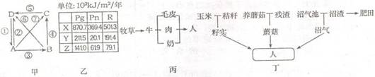 (7分)下图甲为一个长期处于稳定状态的生态系统物质流动示意图;表乙是对甲图中群落各组成成分的能量流动情况调查结果;丙、丁是该生态系统中,人类对物质与能量的利用情况部分示意图。据图回答: