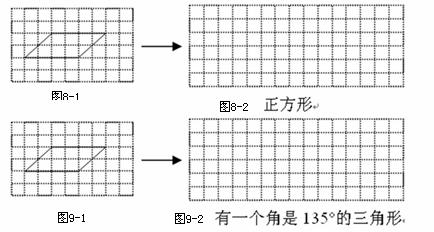分别在图8-1、图9-1中,经过平行四边形纸片的任意一个顶点画一条裁剪线,沿此裁剪线将平行四边形纸片裁成两部分,按所采裁图形的实际大小,在图8-2中拼成正方形,在图9-2中拼成一个角是