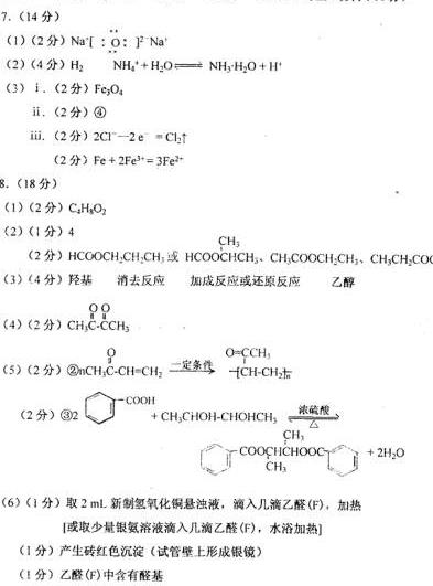 (3)没有吸收圆底烧瓶中水蒸气的装置(或答CO2中混有的水蒸气也会被C吸收);干燥管与空气相通,空气中的CO2和水蒸气也会被吸收;反应结束后,装置内残留的CO2不能完全排除;等等。(答案合理均给分) (每空1分,共2分)(4)①过氧化钠 (2分)过氧化钠与浓氨水中的H2O反应生成氢氧化钠和氧气,同时放出大量热,温度升高使氨的溶解度减小而逸出;氢氧化钠电离出的OH-增大了氨水中OH-浓度,促使氨水电离平衡左移,导致氨气放出 (2分)
