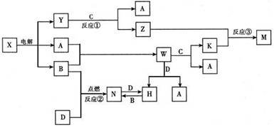 27.(15分)A、B、C、D是中学化学常见单质,其中C、D是金属,构成它们的元素的原子序数分别为a、b、c、d,且2(a+b)=3(c-a);X、Y、Z、M、N、W、H、K是常见化合物,M为白色沉淀,它们之间有如下转化关系(图中反应物和生成物中的H2O已略去)
