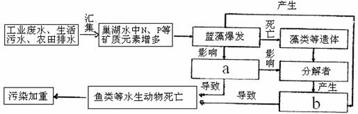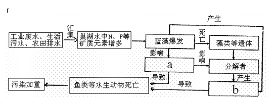 Ⅱ.近年来,巢湖在每年的梅雨季节,都会不同程度地发生水华(蓝藻爆发)现象,下面是发生水华现象时,巢湖生态系统中一些成分的关系图。请回答: