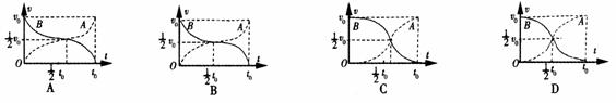 8. 如图所示,在足够大的光滑水平面上放有质量相等的物块A和B,其中A物块连接一个轻弹簧并处于静止状态,物块B以速度v0向着物块A运动.当物块与弹簧作用时,两物块在同一条直线上运动.则在物块A、B与弹簧相互作用的过程中,两物块A和B的v-t图象正确的是 ![]()