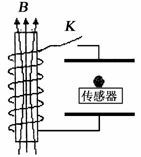 如图所示,两块水平放置的金属板距离为d,用导线、电键K将之与一个n匝的线圈连接,线圈置于方向竖直向上的均匀变化的磁场B中。两板间放一台小压力传感器,压力传感器上表面绝缘,在其上表面静止放置一个质量为m、电量为+q的小球。K闭合时传感器上的示数是K断开时传感器上示数的一半。