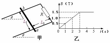 如图甲所示,两根足够长、电阻不计的光滑平行金属导轨相距为L1=1m,导轨平面与水平面成θ=30°角,上端连接阻值R=1.5Ω的电阻;质量为m=0.2kg、阻值r=0.5Ω的金属棒ab放在两导轨上,距离导轨最上端为L2=4m,棒与导轨垂直并保持良好接触。整个装置处于一匀强磁场中,该匀强磁场方向与导轨平面垂直,磁感应强度大小随时间变化的情况如图乙所示。为保持ab棒静止,在棒上施加了一平行于导轨平面的外力F, g=10m/s2求: