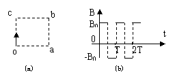 (18分)如图所示的正方形平面oabc内,存在着垂直于该平面向外的匀强磁场,磁感应强度大小为B,已知正方形边长为L,一质量为m,带电量为+q的粒子(不计重力)在t=0时刻平行于oc边从0点射入磁场中,(1)若带电粒子从a点射出磁场,求带电粒子在磁场中运动的时间以及初速度的大小;(2)若磁场的磁感应强度按如图所示的规律变化,规定磁场向外的方向为正方向,磁感应强度的大小为Bo,则要使带电粒子能从oa边界射出磁场,磁感应强度B的变化周期T的最小值应为多少?(3)若所加磁场与第(2)问中相同,则要使粒子从b点沿ab方向射出磁场,满足这一条件的磁感应强度的变化周期T及粒子射入磁场时的速度Vo应为多少?(不考虑磁场变化产生的电场 )