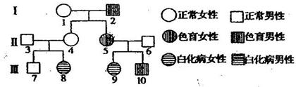 ⑶ 调查中发现一男生(Ⅲ10)患有色盲,其同胞姐姐患有白化病,经调查其家族系谱图如下:
