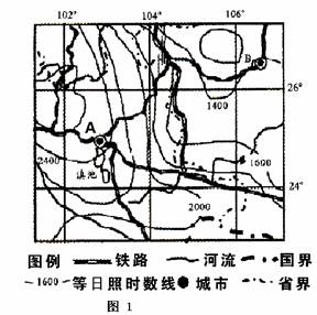 (1)说明图1中AB两城市日照时数相差约多少小时并对比分析差异原因。(6分)